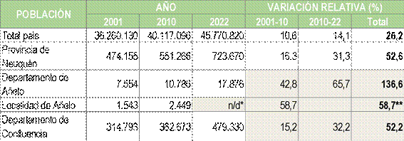 Total país y provincia del Neuquén. Cantidad de población y variación intercensal del Departamento de Añelo y Confluencia. 2001, 2010 y 2022