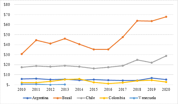 Comparativa de exportaciones a China: Argentina, Brasil, Chile, Colombia y Venezuela entre 2010 y 2020 (en miles de millones de USD)[1]