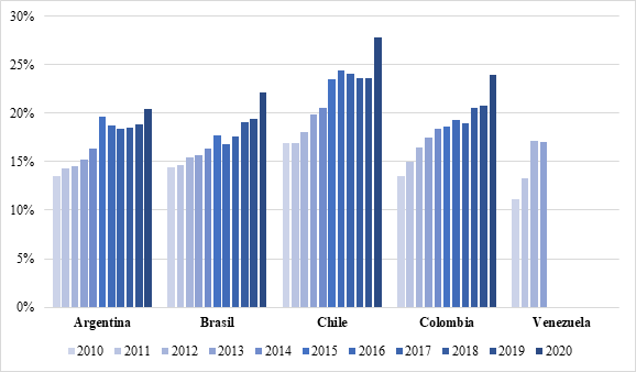 Participación de China como socio importador para Argentina, Brasil, Chile, Colombia y Venezuela entre los años 2010 y 2020 (en % del total de importaciones)