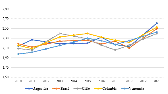 Además de las diferencias estructurales, estos países tienen relaciones comerciales variables con China, lo que permite observar cómo la nacionalidad influye en la opinión pública en el contexto de diferentes niveles de interacción económica. La Figura 1 muestra la evolución de las exportaciones de Argentina, Brasil, Chile, Colombia y Venezuela a China entre 2010 y 2020. Brasil lidera claramente en términos de volumen exportado, con un aumento significativo a partir de 2017, seguido por Chile con una tendencia estable al alza. Por último, Argentina, Colombia y Venezuela tienen volúmenes menores y fluctuaciones notables, siendo más constantes las exportaciones de Argentina.