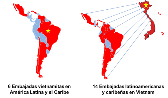 El solo hecho de que haya un aumento de 11 a 14 países latinoamericanos con Embajadas en Hanói implica la relevancia de este país como puente con el Sudeste Asiático y de su creciente prestigio. En el plano comercial de Vietnam con América Latina y el Caribe, si bien se concentran más del 80 % de los negocios solo en Brasil, México, Argentina y Chile, puede decirse que se amplían los lazos con países como Colombia, Perú, Panamá, El Salvador y República Dominicana como forma de diversificación de los mercados, y especialmente cuando algunos de estos tienen acuerdos comerciales con Estados Unidos. En las inversiones, si bien ya hay una creciente presencia de VIETTEL y PETROVIETNAM, es también un mercado para el avance de VINGROUP a través de su subsidiaria VINFAST. América Latina y el Caribe es un mercado no explorado en tu totalidad por Vietnam con el que se puede lograr desarrollos estratégicos.