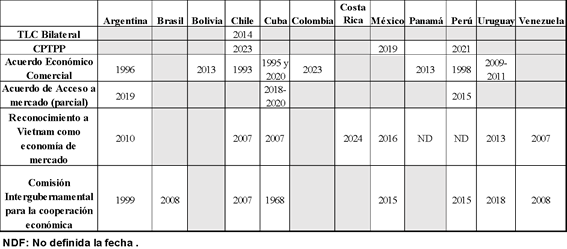 Posterior al establecimiento de las relaciones diplomáticas con la región en 1960, Vietnam comenzó a ampliar sus diversos acuerdos comerciales bilaterales con los países del área. A la vez, creó varios mecanismos de consultas, como la primera Comisión Mixta, que estableció en esta parte del mundo con Cuba en 1968, y que posteriormente en la década de los años setenta se transformó en Comisión Intergubernamental para la Cooperación Económico-Comercial y Científico Técnica. Luego, en los años noventa, fue ampliando los acuerdos, convenios, entre otros, con otros países, así como también varios reconocieron a Vietnam como economía de mercado (Cuadro 1).