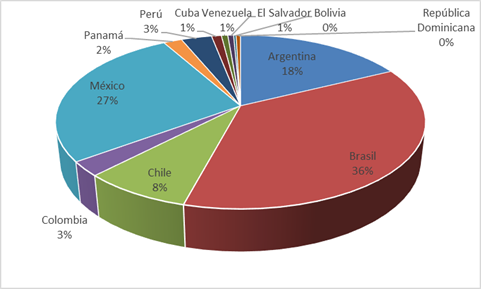 Parte en % por países del total del
