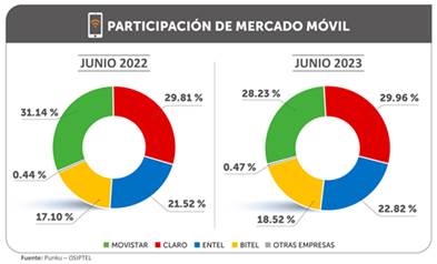OSIPTEL. (2023). Claro, Entel y Bitel incrementaron su participación en el mercado de líneas móviles al primer semestre de 2023. OSIPTEL https://www.osiptel.gob.pe/portal-del-usuario/noticias/claro-entel-y-bitel-incrementaron-su-participacion-en-el-mercado-de-lineas-moviles-al-primer-semestre-de-2023/