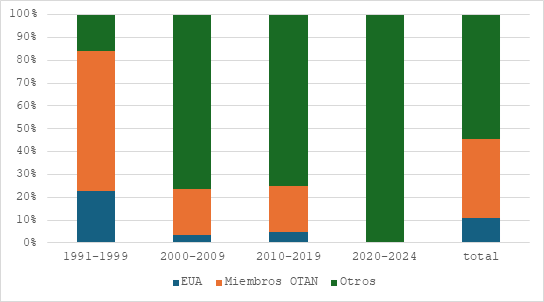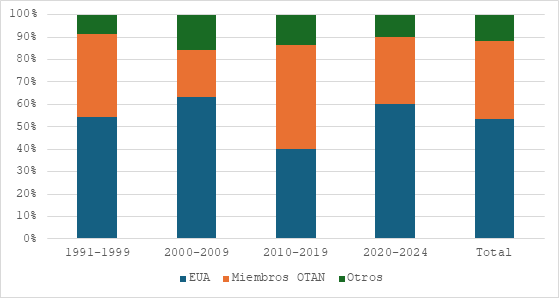Peso de los EUA (%) en las adquisiciones militares de Venezuela (1991-2024)
