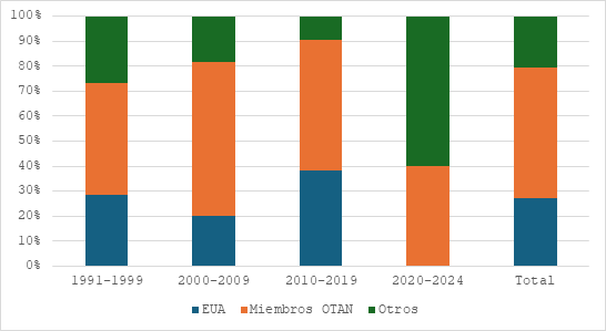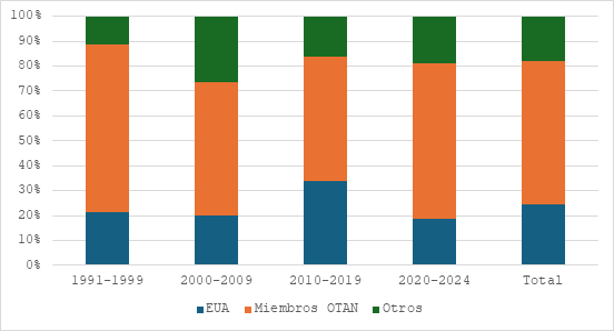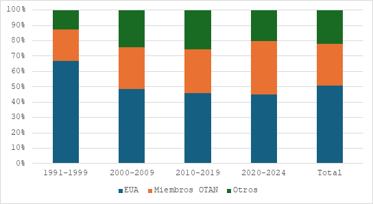 Esta preponderancia militar de los EUA, cuya presencia en América del Sur se ve potenciada por la cercanía geográfica, llevó a que los componentes de los sistemas de armas adquiridos por los países sudamericanos tengan una fuerte presencia estadounidense. Es decir, la potencia dominante y sus aliados de la Organización del Tratado el Atlántico Norte (OTAN) históricamente fueron los principales proveedores de armas de la región, particularmente luego del final de la Guerra Fría (Gráfico 1; Gráfico 2; Gráfico 3; Gráfico 4; Gráfico 5).