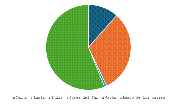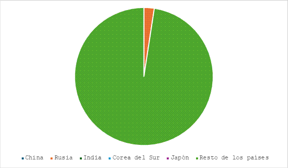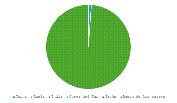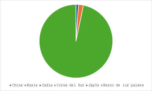 Los casos de Argentina, Chile, Brasil y Colombia son similares dada la mínima participación de los países de Asia Pacífico en las incorporaciones militares de estos países (Gráfico 7; Gráfico 8; Gráfico 9; Gráfico 10). La participación de los países de Asia Pacífico en sus adquisiciones es muy menor, colocándose por debajo del 5 %. Es destacable no solo la baja participación de China y Rusia como proveedores de armas, sino también la baja presencia de sistemas provenientes de países aliados de los EUA en materia de seguridad, como Corea del Sur, India y Japón.