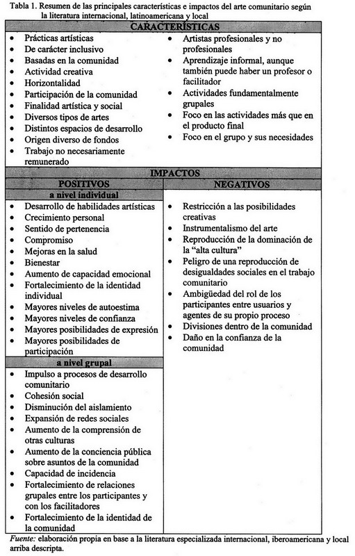 Este artículo revisa el término “arte comunitario” (community arts). En primer lugar se hace un breve recorrido histórico a nivel internacional, en tanto es un término surgido principalmente en diferentes países angloparlantes y utilizado para describir prácticas artísticas de naturaleza grupal, que implican la participación en un proceso creativo y su desarrollo en la comunidad. Se presentan sus antecedentes, definiciones, impactos y metodología aplicadas. Del mismo modo, se presenta una revisión bibliográfica en base a la literatura en español, en tanto se entiende que esta noción no puede comprenderse exclusivamente desde tal perspectiva para estudios alejados de aquellos ámbitos; aquí se intenta analizarlo dentro de la complejidad latinoamericana frente a la herencia anglosajona del término. El fin último es conocer si este término es aplicable en el ámbito local y cuál es el grado de avance en la investigación académica sobre el arte comunitario en estos contextos.Archivos adicionales