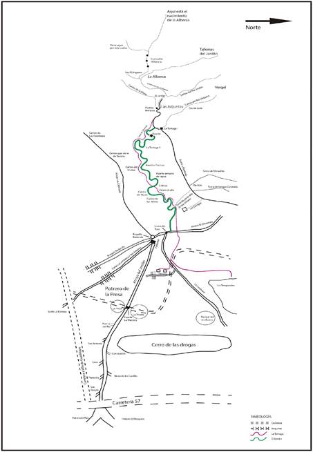 Los atributos descritos en las dinámicas relacionales son conocidos como topónimos, los que son plasmados en una cartografía local por los ejidatarios y sus familiares, quienes indubitablemente son expertos. En tal cartografía corren una serie de venas que inician en una cuenca llamada del Río Jordán (municipio de Catorce, en la zona de La Maroma) y terminan en otros ejidos hasta llegar a la carretera principal que comunica a la capital potosina con otros estados. Cabe recalcar que esta cuenca no está registrada o reconocida en alguna topografía científica o geopolítica[10] porque “el diseño de representaciones por uso del agua está dominado por los Consejos de Cuenca[11], el cual impide que tenga cabida en ellos la voz de los grupos indígenas” (Peña, 2007, p. 179). El esquema dibujado por los campesinos comprende 51 dinámicas relacionales[12], incluyendo las obras del proyecto de la Conagua (ver esquema 1). Por motivos de espacio solo se describirán los topónimos concernientes al sistema de riego y a uno que los acompañó durante todo el proceso legal.