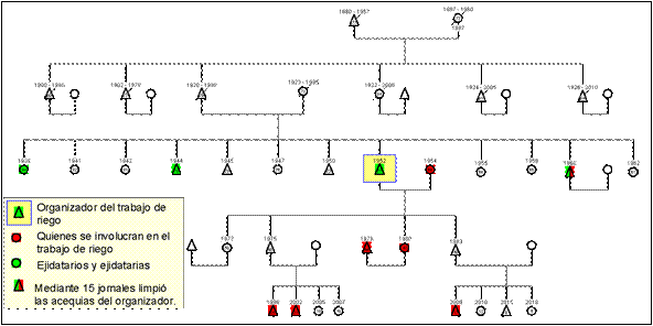 El riego está organizado por medio de relaciones de reciprocidad. Esto es relevante porque solo un 3 % (6 de 220) de los jefes de familia son avecindados[16], mientras que el resto de los residentes están unidos por lazos de parentesco sanguíneo y ritual en referencia a un ejidatario. El parentesco ritual otorga una especial significación al padrinazgo y al compadrazgo. Dichos vínculos parentales están asociados con un cuidado que los campesinos del ejido protagónico sostienen con su entorno. El genograma[17] en el esquema núm. 2 es un ejemplo de la organización del riego. Se centra en un campesino nacido en 1952 (en estudios de parentesco se les identifica como ego), esquematizado en un recuadro amarillo. Su primer hermano (nacido en 1939), su hermano cuarto (nacido en 1944) y su hermano décimo (nacido en 1960) son ejidatarios (señalados en verde). Este último (1960), graficado en rojo y verde, recibe un pago como jornalero por dar mantenimiento a las acequias que riegan las parcelas de su hermano organizador, quien le entrega el equivalente a 15 jornales. Cada jornal es un salario mínimo[18]. En rojo están marcados tres de sus nietos, así como su tercera hija (nacida en 1980), su yerno (esposo de esta) y la esposa del organizador.