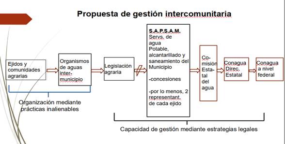 En la propuesta de estos gestores hídricos ellos deben ser el punto de partida, ya que el Estado, por medio de la legislación agraria, los reconoce, anteponiendoles la intervención de las concesiones. Estas empresas no reconocen la capacidad gestora del ejido protagonista, sino que los excluye e invisibiliza. Además de ser uno de los agentes frontales que en el día a día los escruta con la imposición de una normatividad ajena a la de ellos. Ellos deben ser el inicio porque en términos de inalienabilidad un pago en dinero marca una ruptura, tal como se observa en el esquema núm. 2. Los campesinos de este modelo aspiran a que por lo menos dos de ellos por cada ejido o comunidad agraria los representen ante un organismo de aguas a nivel intermunicipal. Hasta esos dos niveles la gestión se rige mediante relaciones inalienables, enfrentándose de manera antagónica y en bloque ante la concesionaria Servicios de Agua Potable, Alcantarillado y Saneamiento del Municipio (SAPSAM), a la Comisión Estatal del Agua y a la Conagua, tanto a nivel estatal como federal. Este bloque marca una ruptura tajante ante las relaciones inalienables porque, como su nombre lo indica, las relaciones alienadas, totalmente despersonalizadas, son servicios.