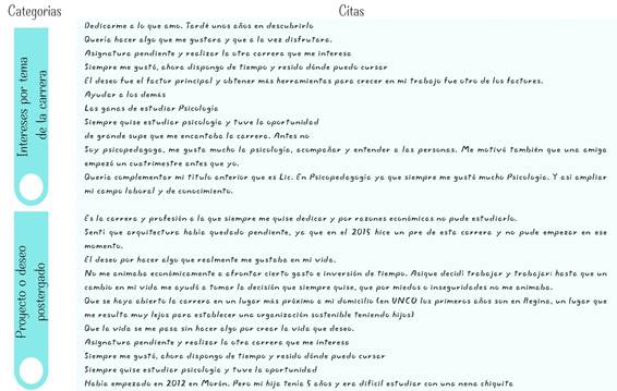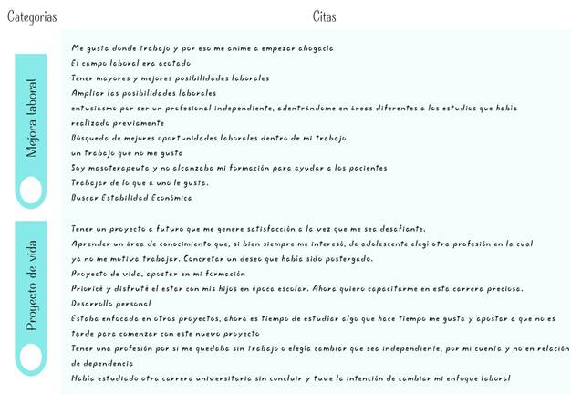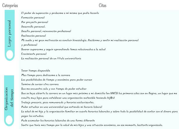 Asimismo, la categoría de deseo postergado muestra cómo muchas de estas mujeres retoman un proyecto que había quedado suspendido por distintas circunstancias. Esto da cuenta de trayectorias no lineales, donde los estudios superiores no se desarrollan inmediatamente después de la educación media, sino que se reactivan en momentos más avanzados del ciclo vital (Cosciuc, 2021).
